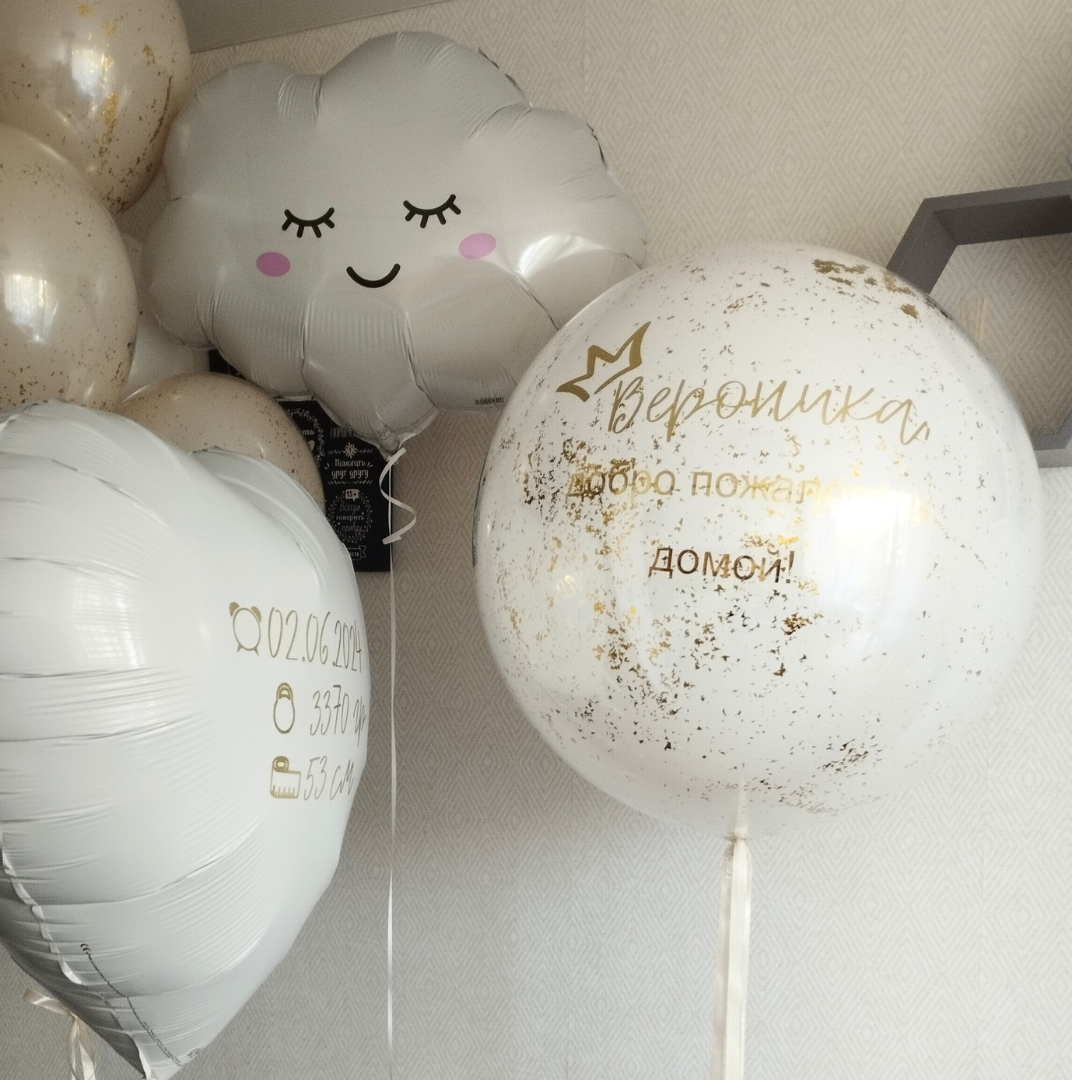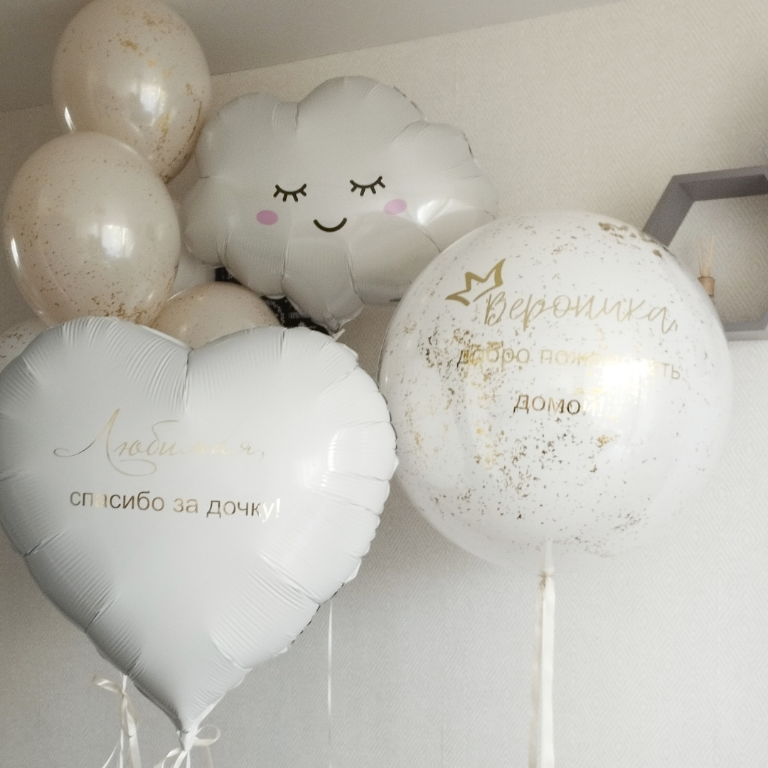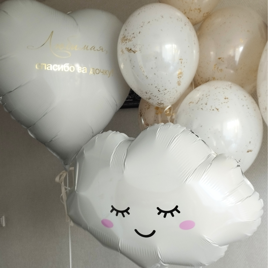 Фигура облако 1 шт Шары: -сердце 80 см с индивидуальной надписью с двух сторон белое 1 шт -"стеклянный" шар" с золотым конфетти и индивидуальной надписью 60 см 1 шт -"стеклянный" шар кремовый 3 шт -"стеклянный" шар белый 2 шт Количество, цвета и варианты шаров в составе сета вы можете менять на ваш вкус. Готовые сеты представлены для примера. Фольгированные шары летают от 3х дней и более. Латексные шары обработаны hi-float (полёт от 2х дней и более). Цветопередача может отличаться на несколько тонов в зависимости от вашего монитора.