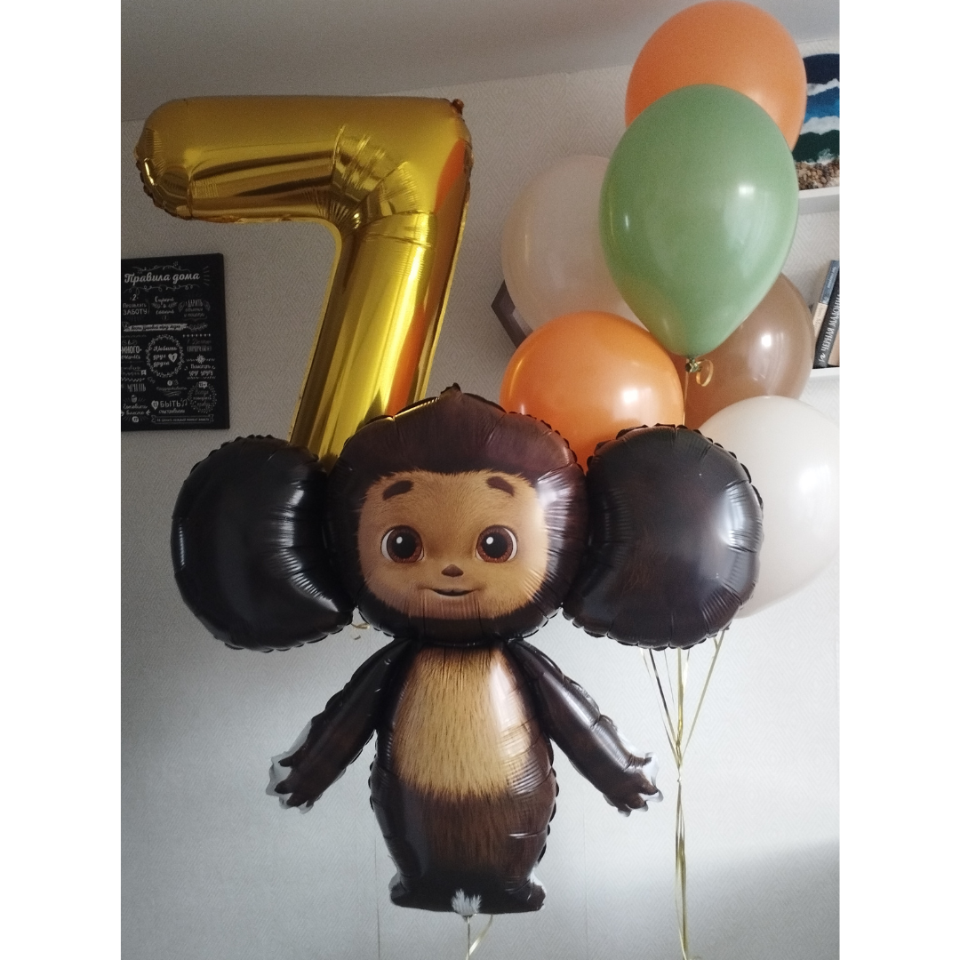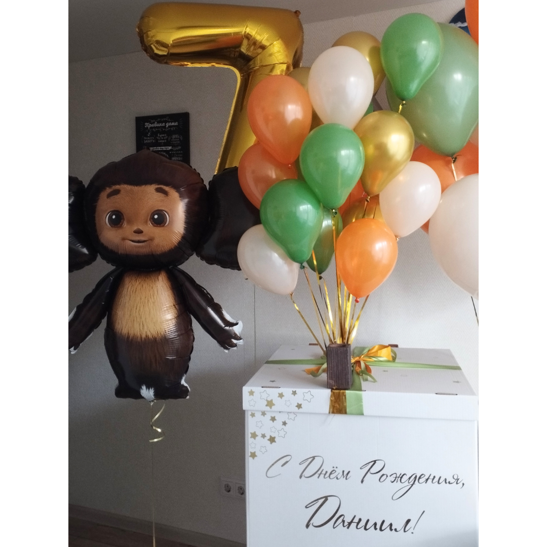 Цифра золото 1 шт Фигура Чебурашка 1 шт Коробка белая 60*60*60 для шаров 1 шт Шары: -минишары в коробку ассорти 30 шт -белый песок 2 шт -эвкалипт 2 шт -оранжевый 2 шт -коричневый 1 шт Количество, цвета и варианты шаров в составе сета вы можете менять на ваш вкус. Готовые сеты представлены для примера. Фольгированные шары летают от 3х дней и более. Латексные шары обработаны hi-float (полёт от 2х дней и более). Цветопередача может отличаться на несколько тонов в зависимости от вашего монитора.