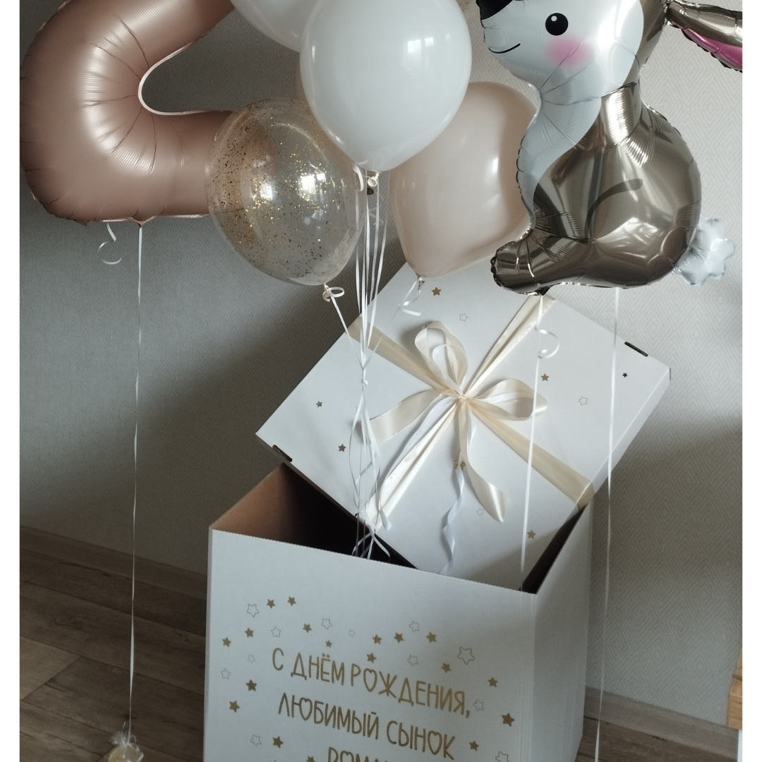 Цифра карамель 1 шт Фигура заяц 1 шт Фигура облако 1 шт Коробка белая 60*60*60 для шаров 1 шт Шары: -белый песок 3 шт -белый 2 шт -шар с конфетти золото крошка 2 шт Количество, цвета и варианты шаров в составе сета вы можете менять на ваш вкус. Готовые сеты представлены для примера. Фольгированные шары летают от 3х дней и более. Латексные шары обработаны hi-float (полёт от 2х дней и более). Цветопередача может отличаться на несколько тонов в зависимости от вашего монитора.