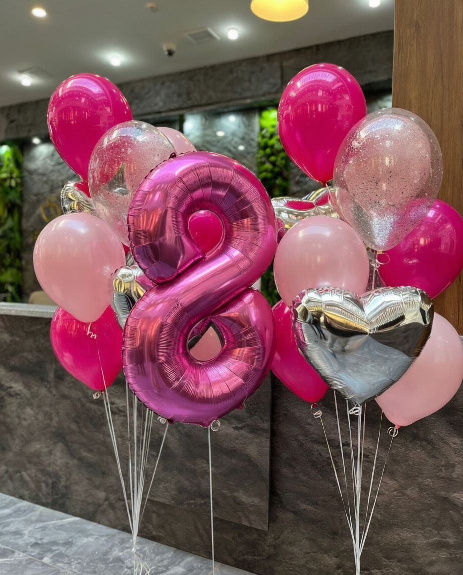 Цифра серебро - 2 шт Сердце фуксия 80 см с надписью - 1 шт Шары: -розовый пастель 4 шт - розовый агат 4 шт -конфетти серебро 4 шт Количество, цвета и варианты шаров в составе сета вы можете менять на ваш вкус. Готовые сеты представлены для примера. Фольгированные шары летают от 3х дней и более. Латексные шары обработаны hi-float (полёт от 2х дней и более). Цветопередача может отличаться на несколько тонов в зависимости от вашего монитора.