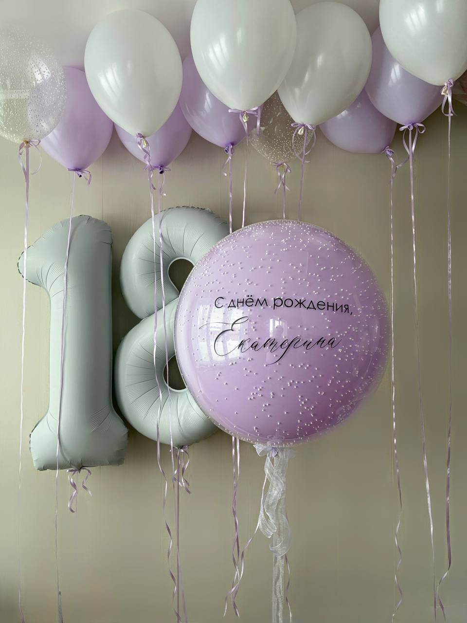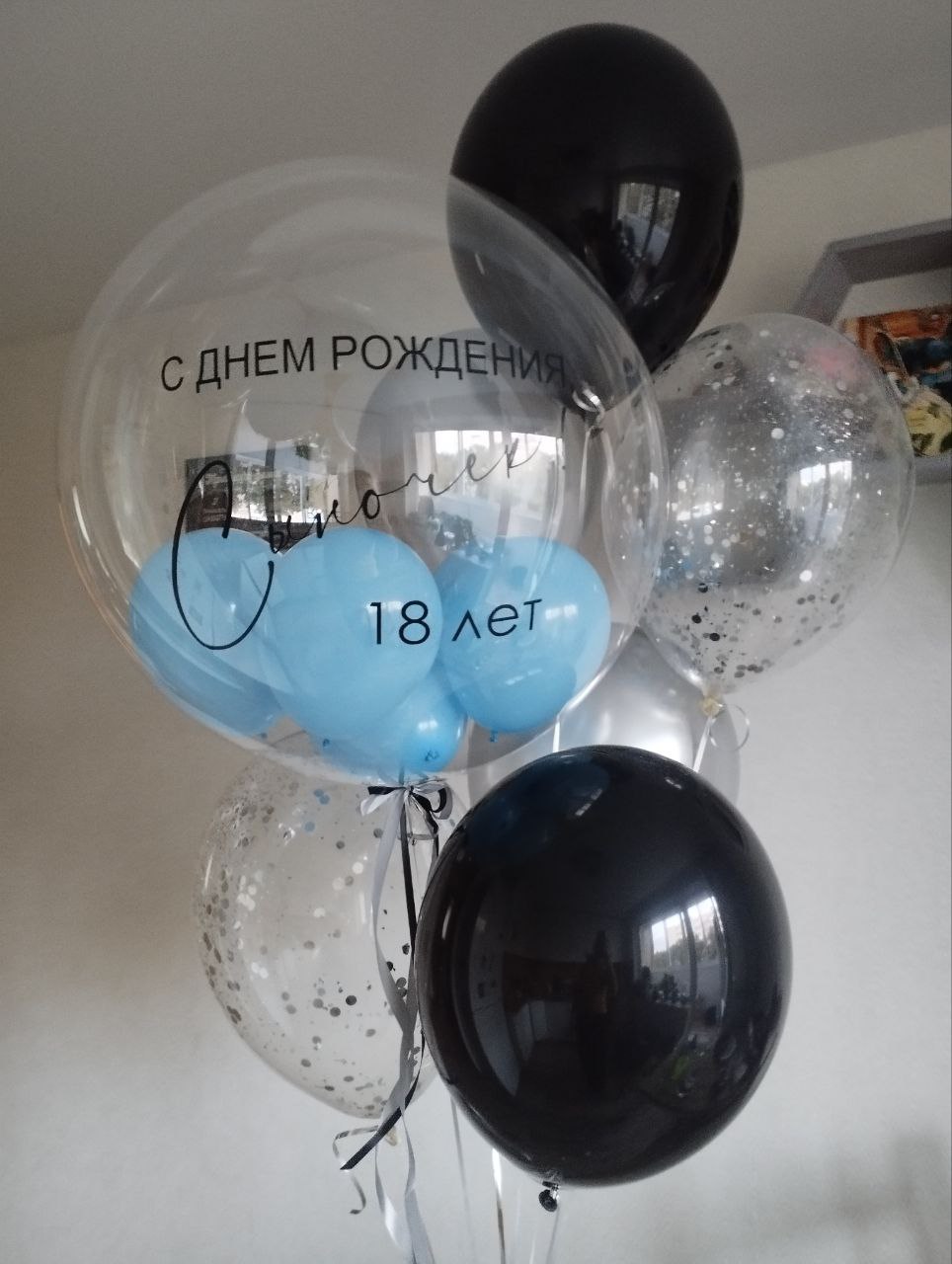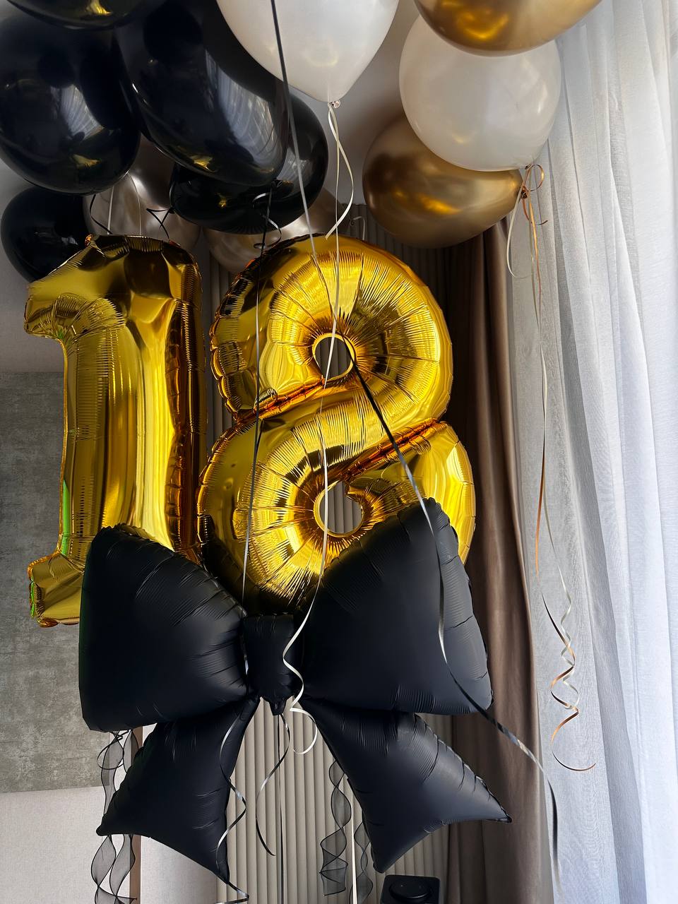 цифры 18, черный бант, 11 шаров под потолок