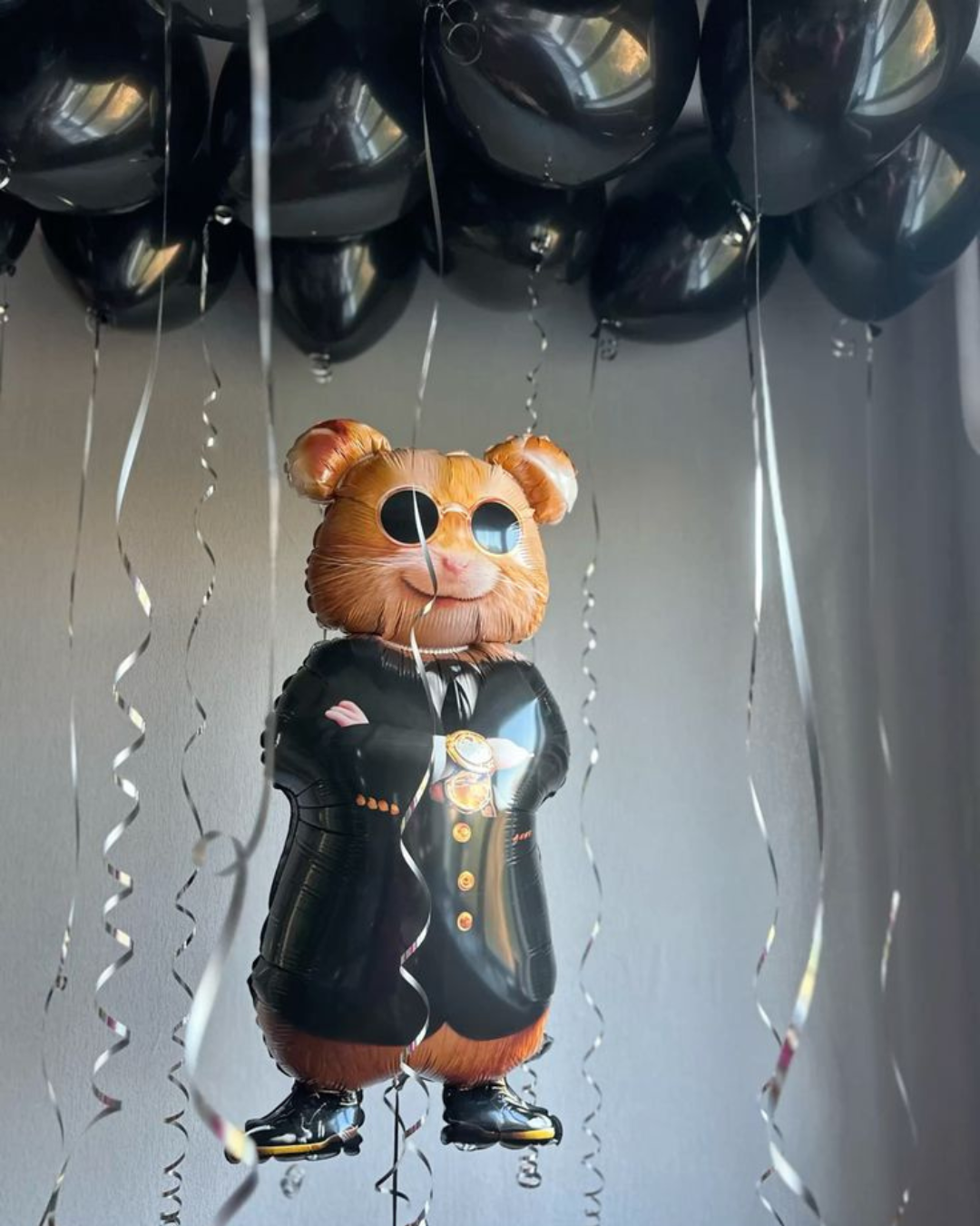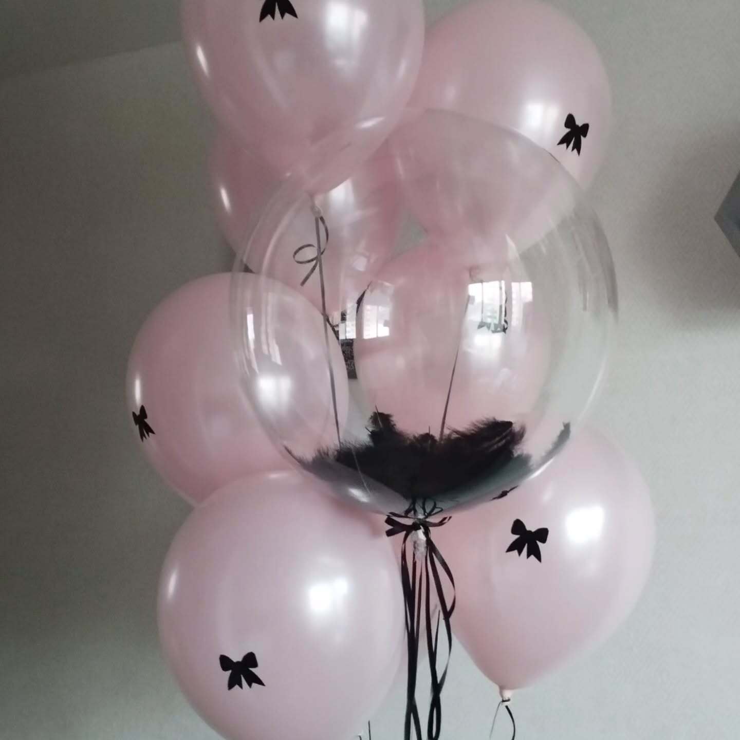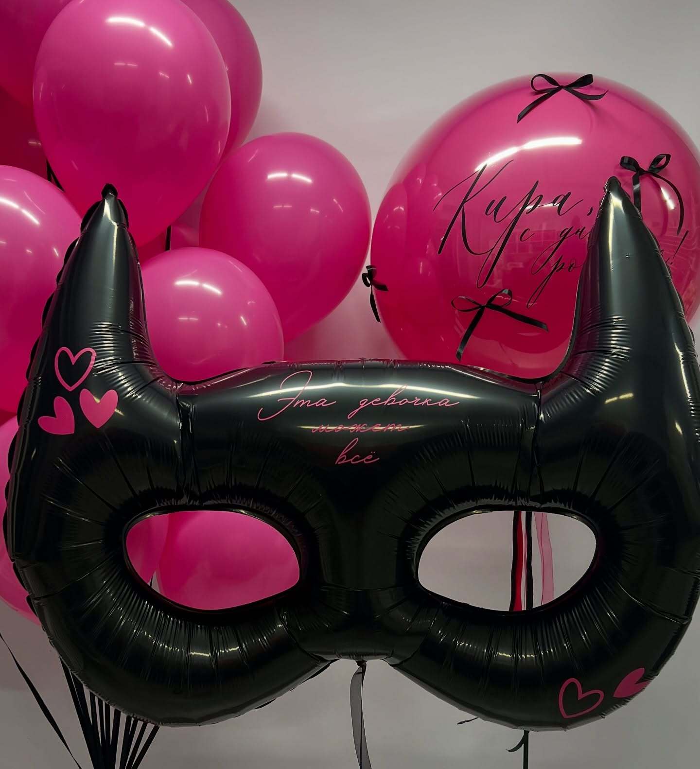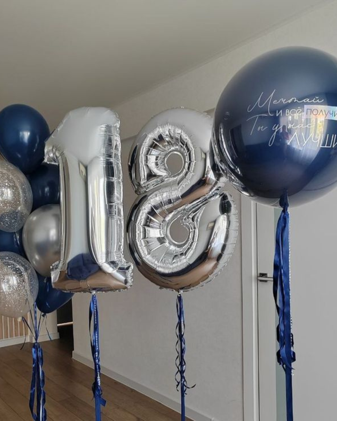 цифры 18, черный бант, 11 шаров под потолок